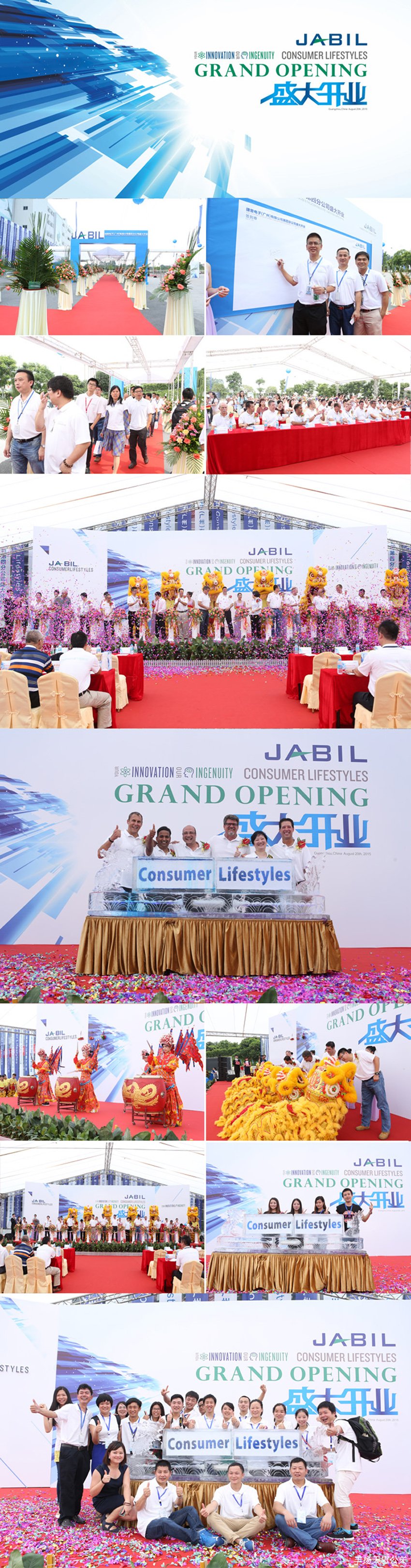 最具傳統文化特色的京劇鼓舞拉開CL開業盛典儀式序幕,傳統而隆重的醒獅儀式更是寄予捷普電子(廣州)有限公司CL分廠開業最美好的祝福,全場讓人震撼的環節不得不提剪彩儀式,16位領導共同見證這歷史性時刻,禮炮齊鳴,轟轟烈烈,精彩繼續不斷,由領導開啟創意冰雕慶賀儀式,與全場共同舉杯慶祝。